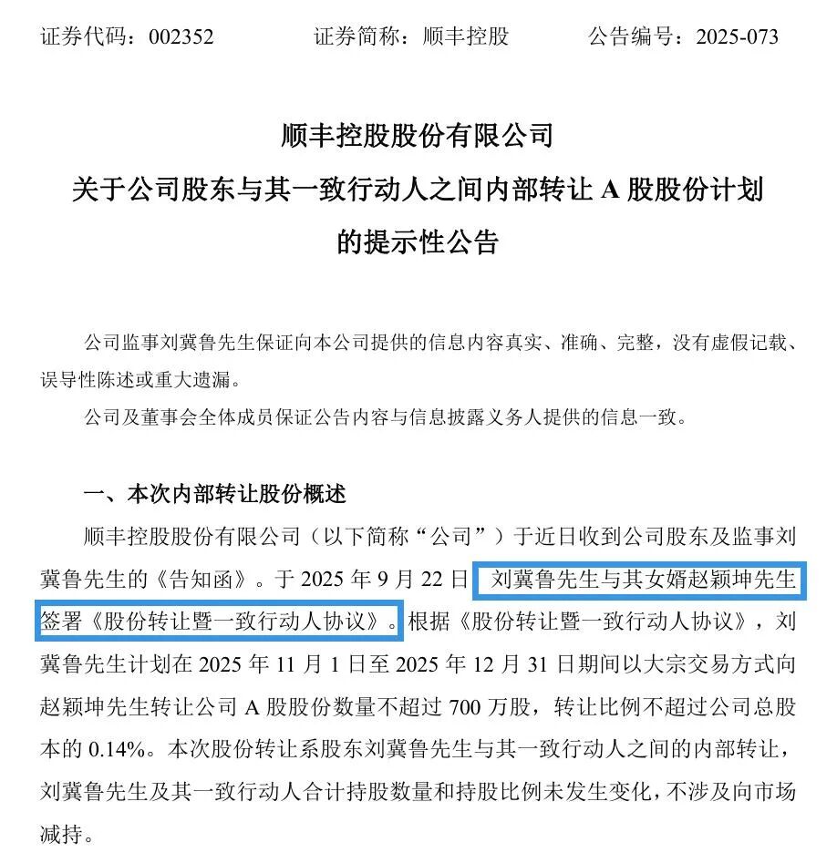 2025年9月22日,顺丰控股股份有限公司发布《关于公司股东与其一致行动人之间内部转让A股股份计划的提示性公告》,公告显示,该公司于近日收到公司股东及监事刘冀鲁的《告知函》。2025年9月22日,刘冀鲁与其女婿赵颖坤签署《股份转让暨一致行动人协议》。根据该协议,刘冀鲁计划在2025年11月1日至2025年12月31日期间以大宗交易方式向赵颖坤转让公司A股股份数量不超过700万股网上配资炒股,转让比例不超过公司总股本的0.14%。