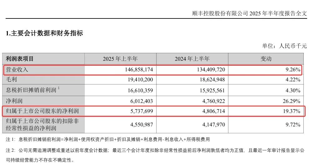 根据最新披露的半年报,2025年上半年,顺丰控股实现营业收入1,468.58亿元,同比增长9.26%;归母净利润为57.38亿元,同比增长19.37%。